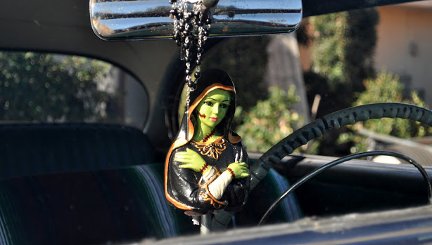 The Guadalupe paintings, I like. Where the sunburst goes around her tall body and she glitters like a fresh piece of flash on the back hatch of a 1974 El Camino on a Friday night. Mary in a Half Shell in the yard art and home-made grottoes, I’m also partial to.